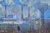 Scenic view in frosty sunny weather. Thick smoke is pouring from the chimneys, the girl is watching the industrial landscape.