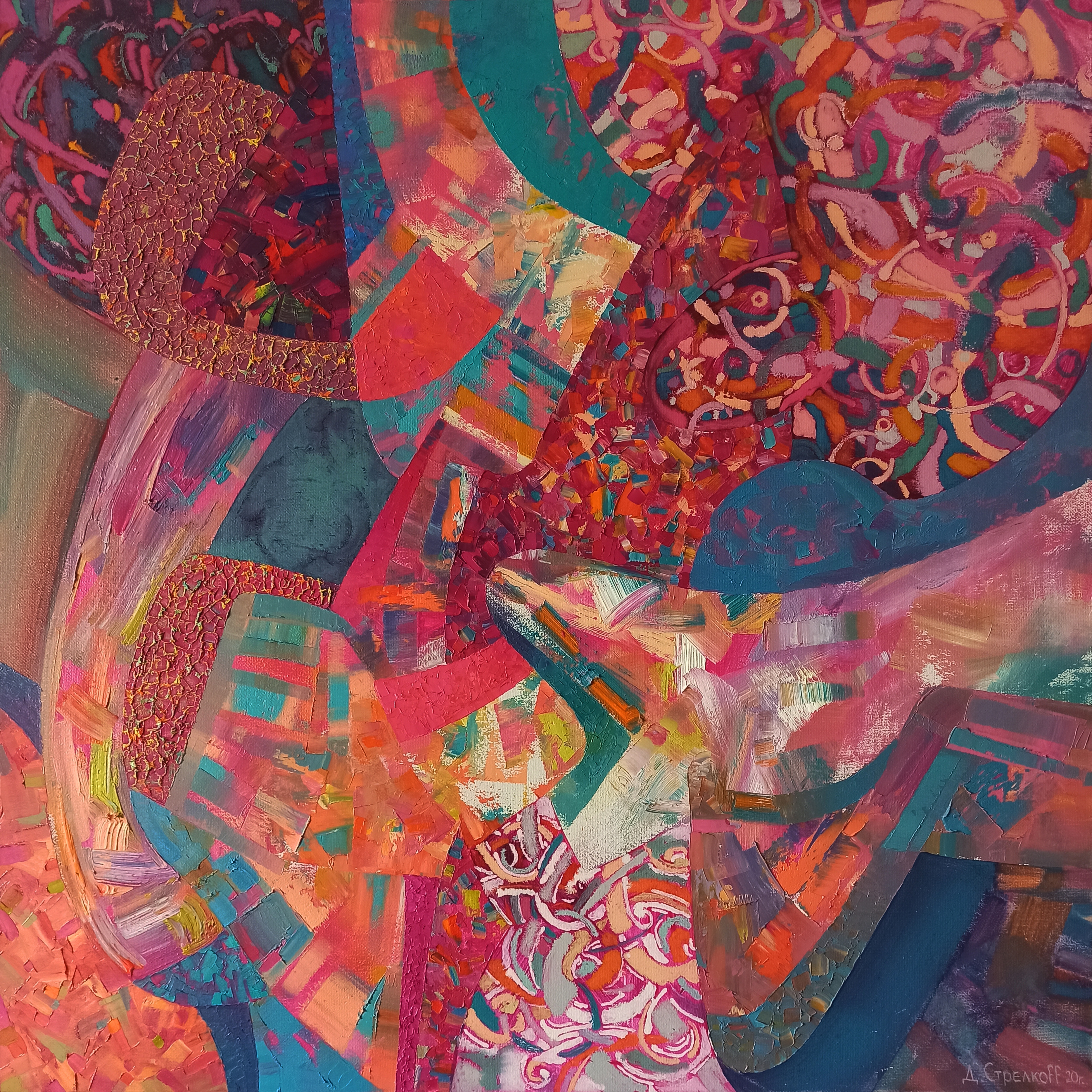 Абстрактная картина, созданная масляными красками на холсте в уникальной авторской художественной манере под названием "Абстрактный эклектизм". Насыщение плоскости картины разнообразнейшими живописными приёмами, фактурами и текстурами вкупе с экспрессивным, динамичным композиционным построением позволяет художнику создать свой особый, неповторимый многомерный мир, видеть, изучать и познавать который можно как в целом на расстоянии, так и вглядываясь в каждый сантиметр изображения.