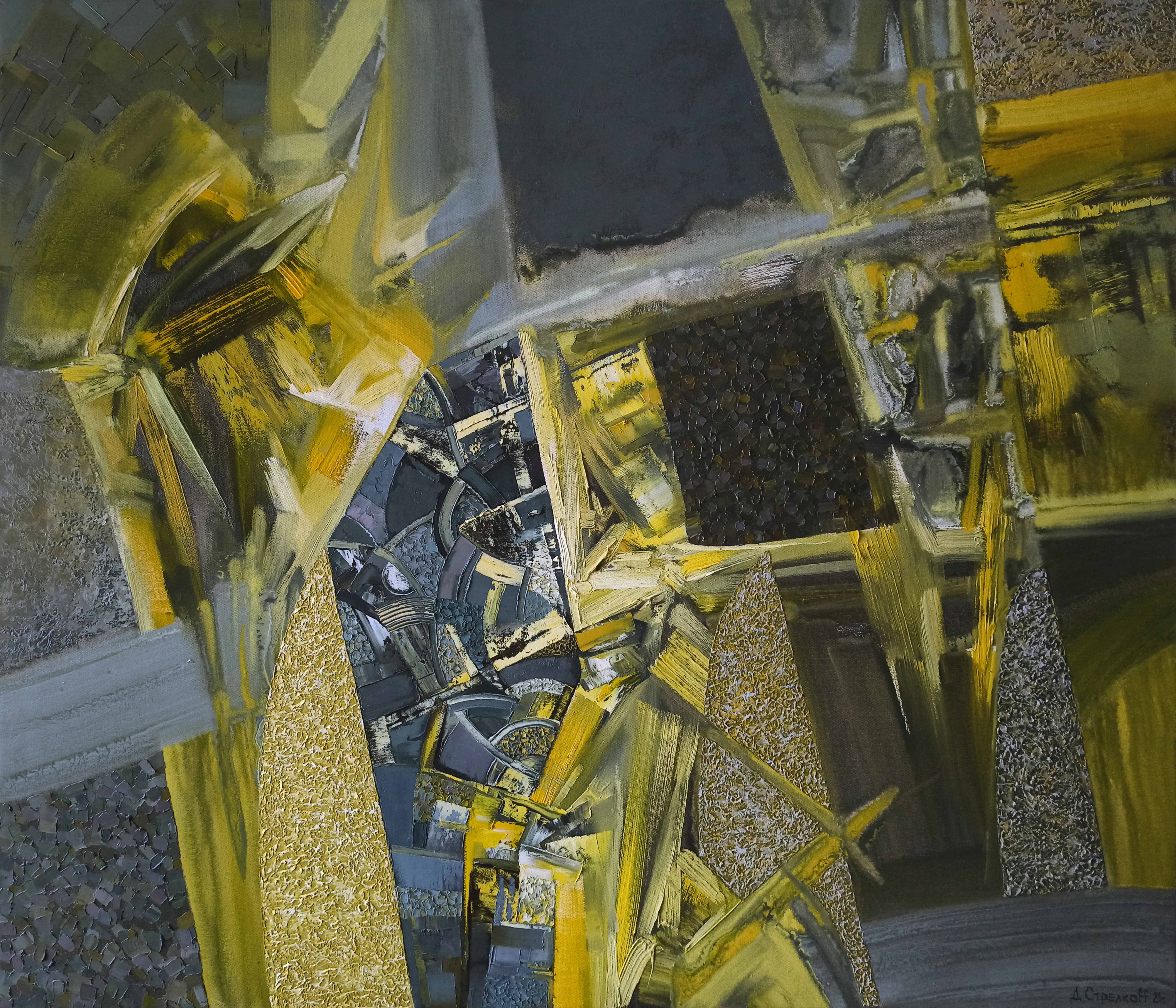 Abstract painting created with oil paints on canvas in a unique authorial artistic style called "Abstract Eclecticism." The saturation of the painting's surface with a variety of painting techniques, textures, and patterns, combined with an expressive, dynamic compositional structure, allows the artist to create a special, unique multidimensional world that can be seen, studied, and explored both as a whole from a distance and by examining every centimeter of the image.
