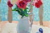 Работа написана на террасе с видом на Чёрное море, которое здесь с солнечными бликами стало фоном. Главные герои композиции — букет роз в белом кувшине, стоящий на залитом светом белоснежном столе. Также на столе можно увидеть подаренные летом фрукты, такие как персики и сливы. Все объекты изображены в контражуре, что создаёт полное ощущение слепящего солнца.