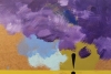 Верхняя часть — это бушующее, драматическое небо или эмоциональное облако. Доминирует насыщенный, густой фиолетовый, смешанный с мазками голубого, зелёного и кремового. Эти мазки нанесены энергично, создавая ощущение взрыва или сильного душевного напряжения.
