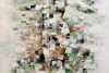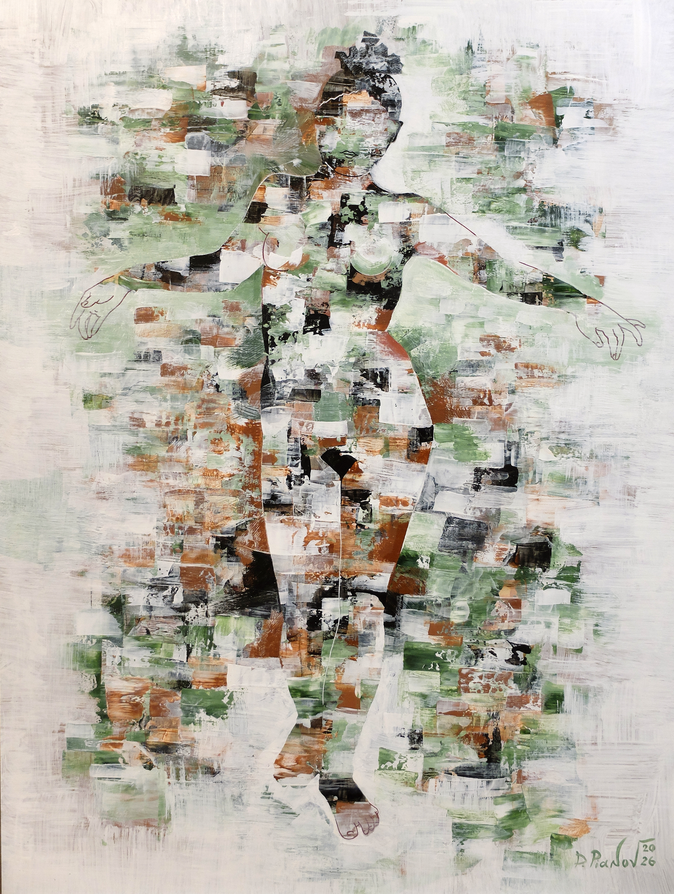However, this figure is not monolithic. It is “assembled” from numerous small, overlapping brushstrokes and rectangular fragments, creating an effect of mosaic or digital pixelation. The dominant color palette consists of earthy tones: ochre, brown, dark green, which contrast with the pure white background.