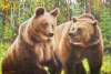 В центре композиции – два медведя, чьи фигуры занимают почти все пространство холста, создавая ощущение их доминирования в этом лесном мире. Художник мастерски передает густую, многоцветную шерсть, используя теплые оттенки коричневого и рыжего, которые прекрасно сливаются с осенним или летним лесом.
