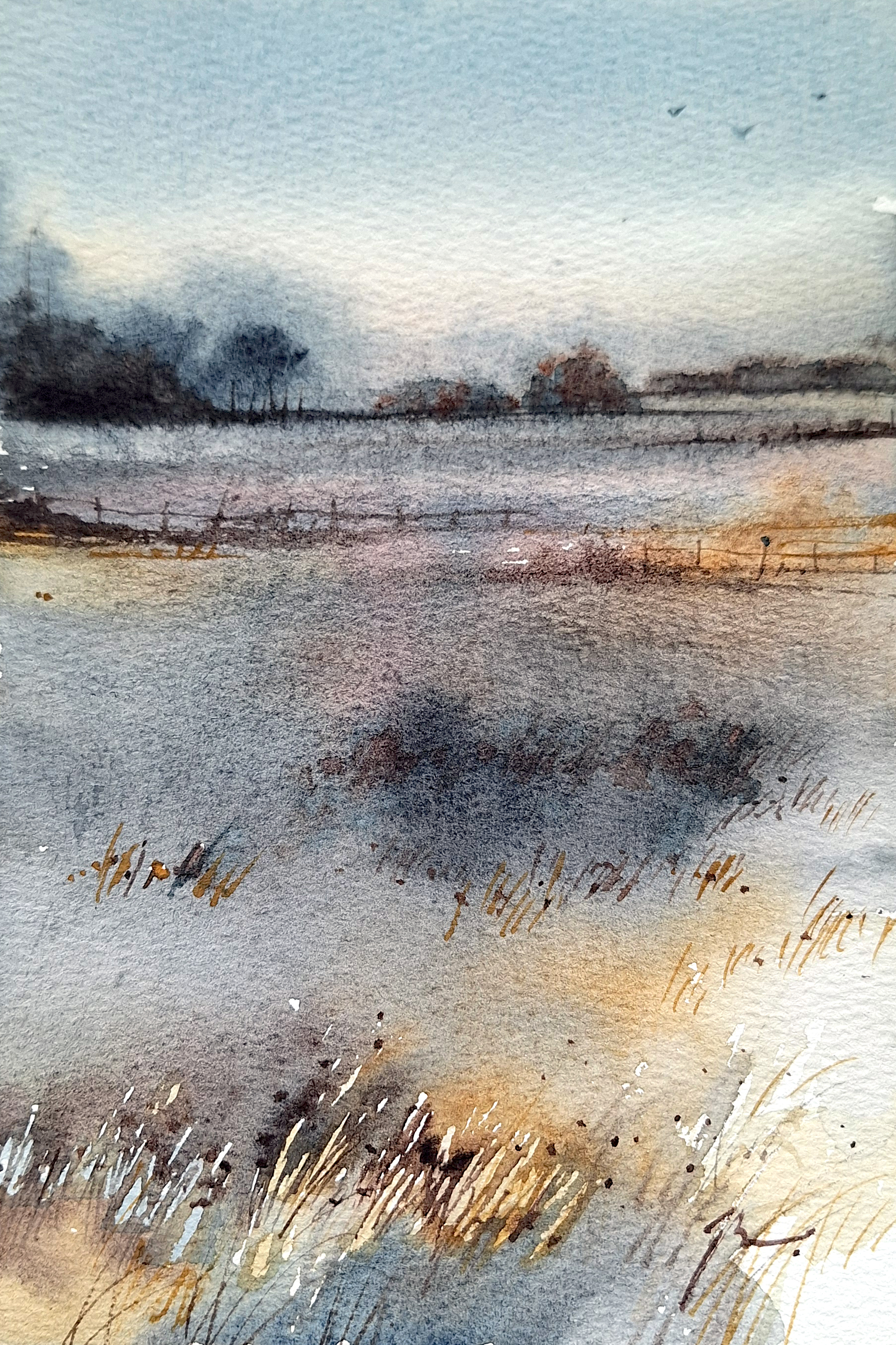 На первый взгляд работа кажется минималистичной. Спокойные, приглушённые тона — серый, охристый, бледно-голубой, с едва уловимыми вкраплениями коричневого и терракотового — создают ощущение тишины и умиротворения. Дарья Валевская мастерски использует прозрачность акварели, чтобы передать влажность воздуха, рассеянный свет и нежную дымку, окутывающую пейзаж.
