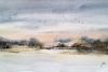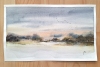 Когда я писала акварель «Зимняя природа», мне хотелось показать самый тихий момент зимнего дня — когда закат уже окрасил небо мягкими персиковыми и серо-голубыми тонами, а ночной холод только приближается.