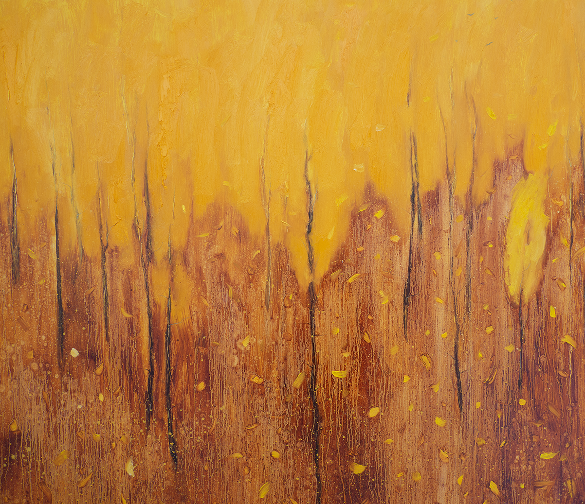It depicts a forest of larch trees. In autumn, the larch trees begin to turn yellow and become fiery red. The forest is beautiful and mesmerizing at this time.