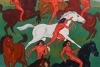 Динамичная картина,где изображены люди и лошади.Акцент на сопоставление тел человека и лошади,их взаимодействие и красоту.