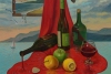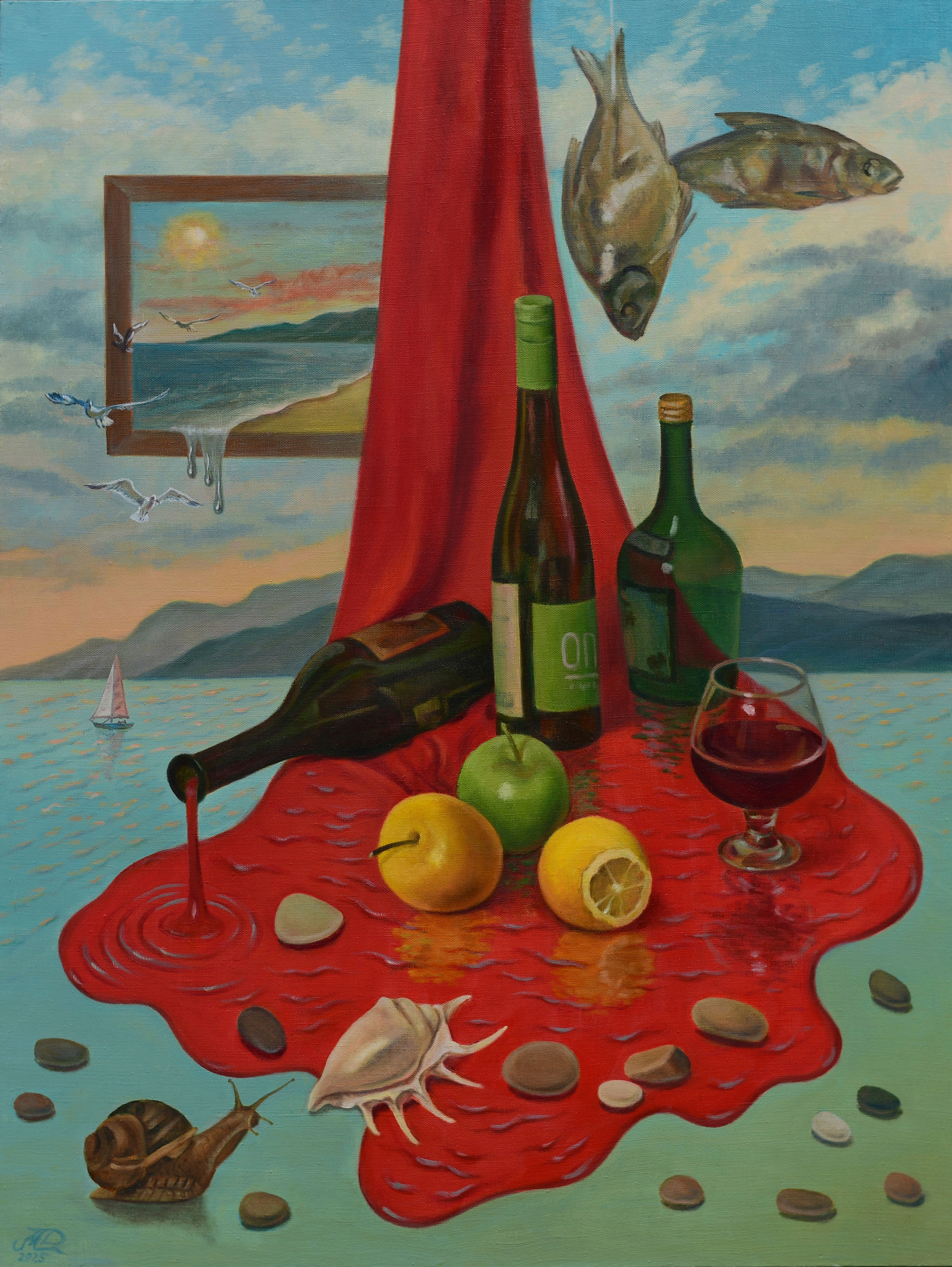 В картине изображён натюрморт, написанный с натуры, вписанный в пейзаж. Картина в картине — сюрреалистический эффект пространства. Связь пейзажа с натюрмортом.