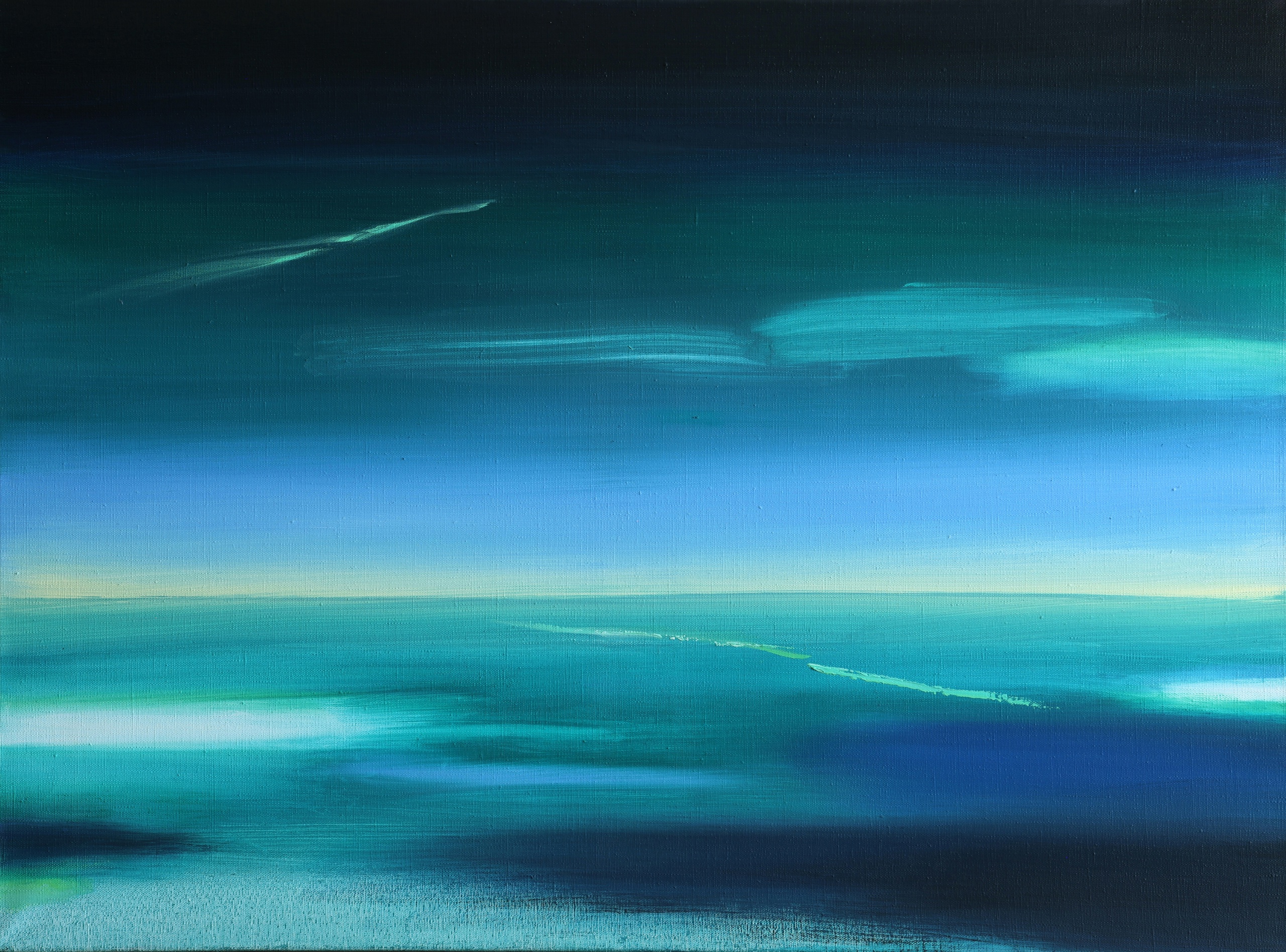 Работа «Отражения» — это взгляд на пространство с большой высоты, почти из космоса. Момент ясно видимого взаимодействия неба и земли, их единства, схожести форм облаков, туманов, озёр. Единое пространство большого мира.