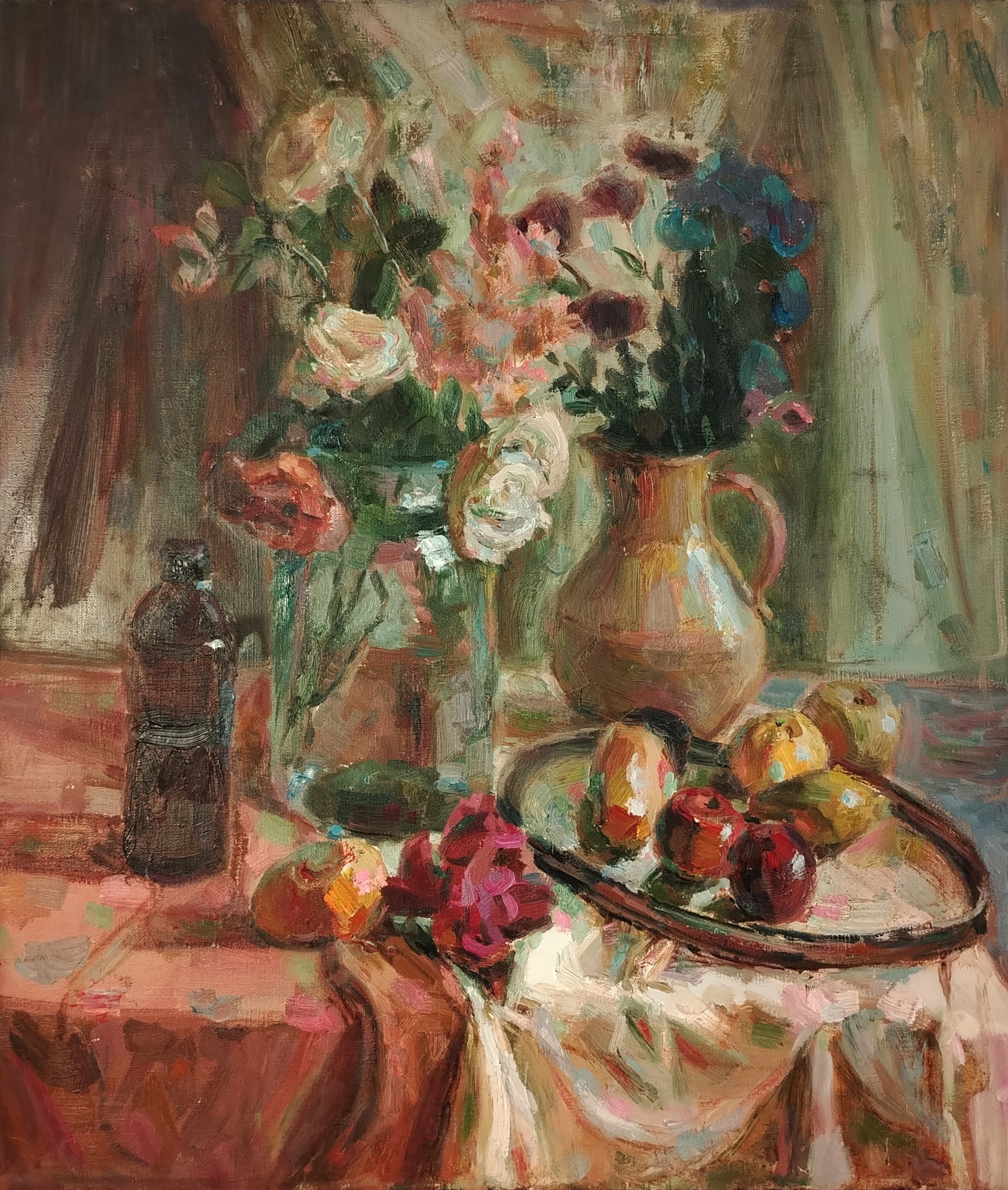 The painting is created with oil on canvas using traditional techniques. It is in a style that references Soviet realism and impressionist art. Bright and rich brushstrokes shape the surface of the painting, making it vivid and expressive. The painting can be displayed both framed and unframed, serving as a striking accent on the wall by itself.