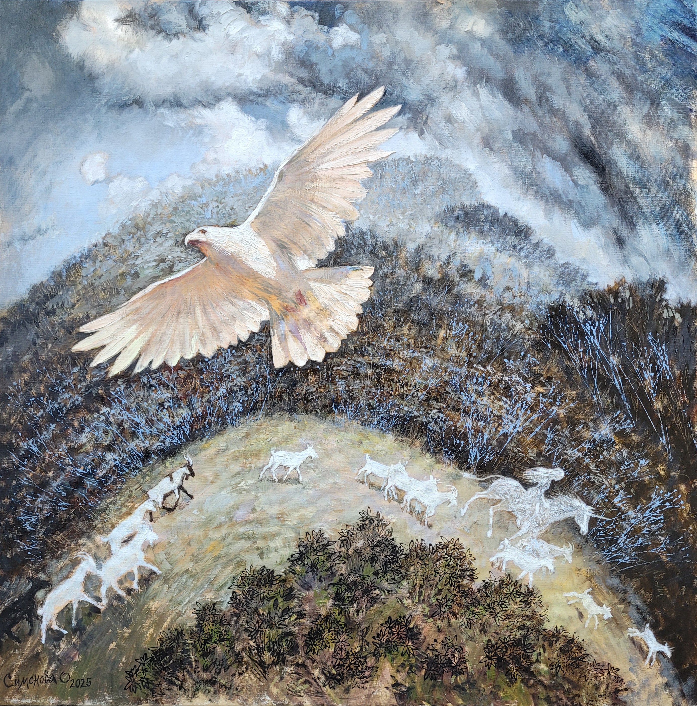 The canvas depicts a majestic white eagle soaring above the herd, like a guide between the earthly and the heavenly. The symbolism of the painting is filled with philosophical meaning: the road of life leading to light and perfection, under the protection of Higher powers.