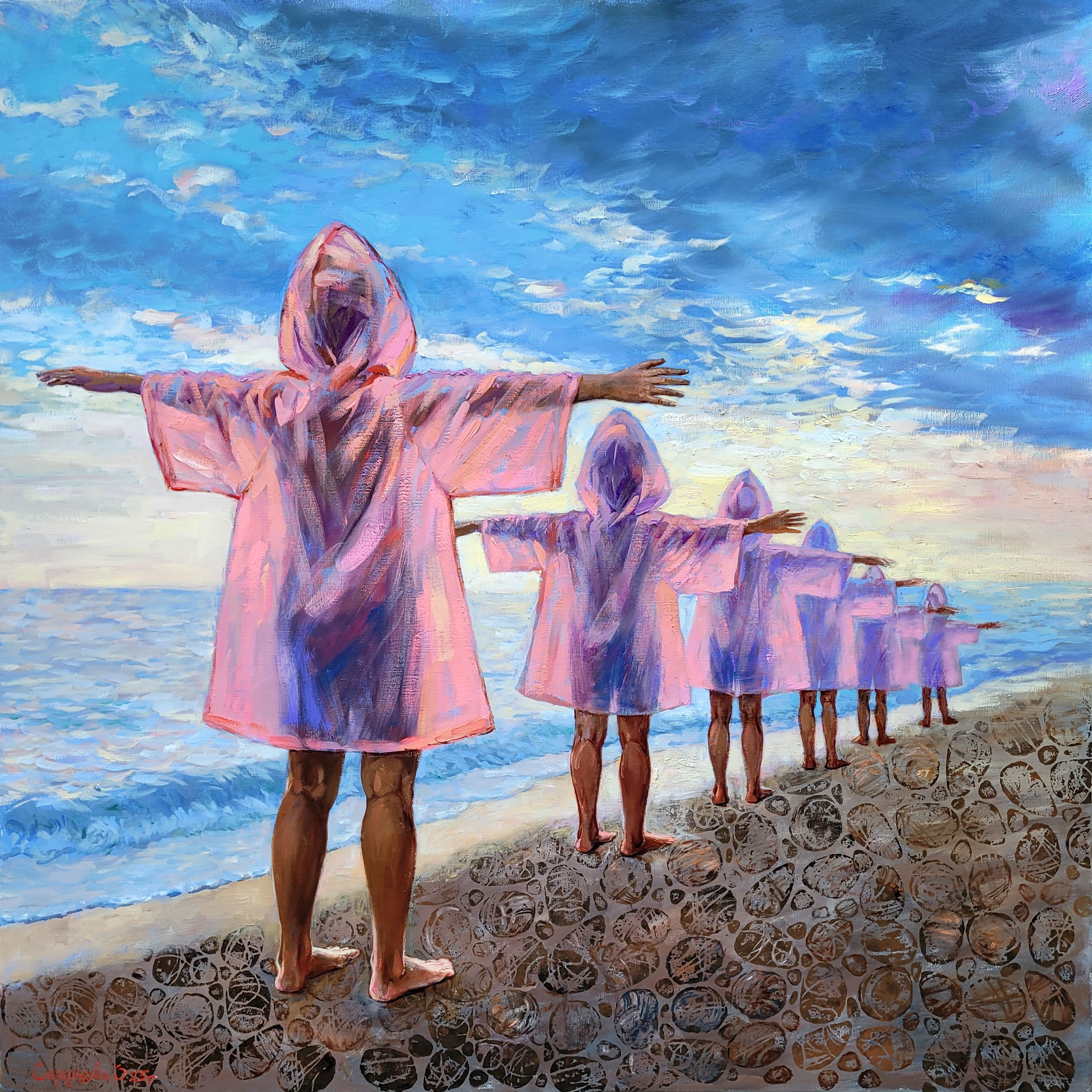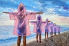 На берегу моря на рассвете выстраиваются дети в одинаковых розовых плащах-дождевиках. Они раскинули руки в стороны, словно живые антенны, ловящие сигналы мира.