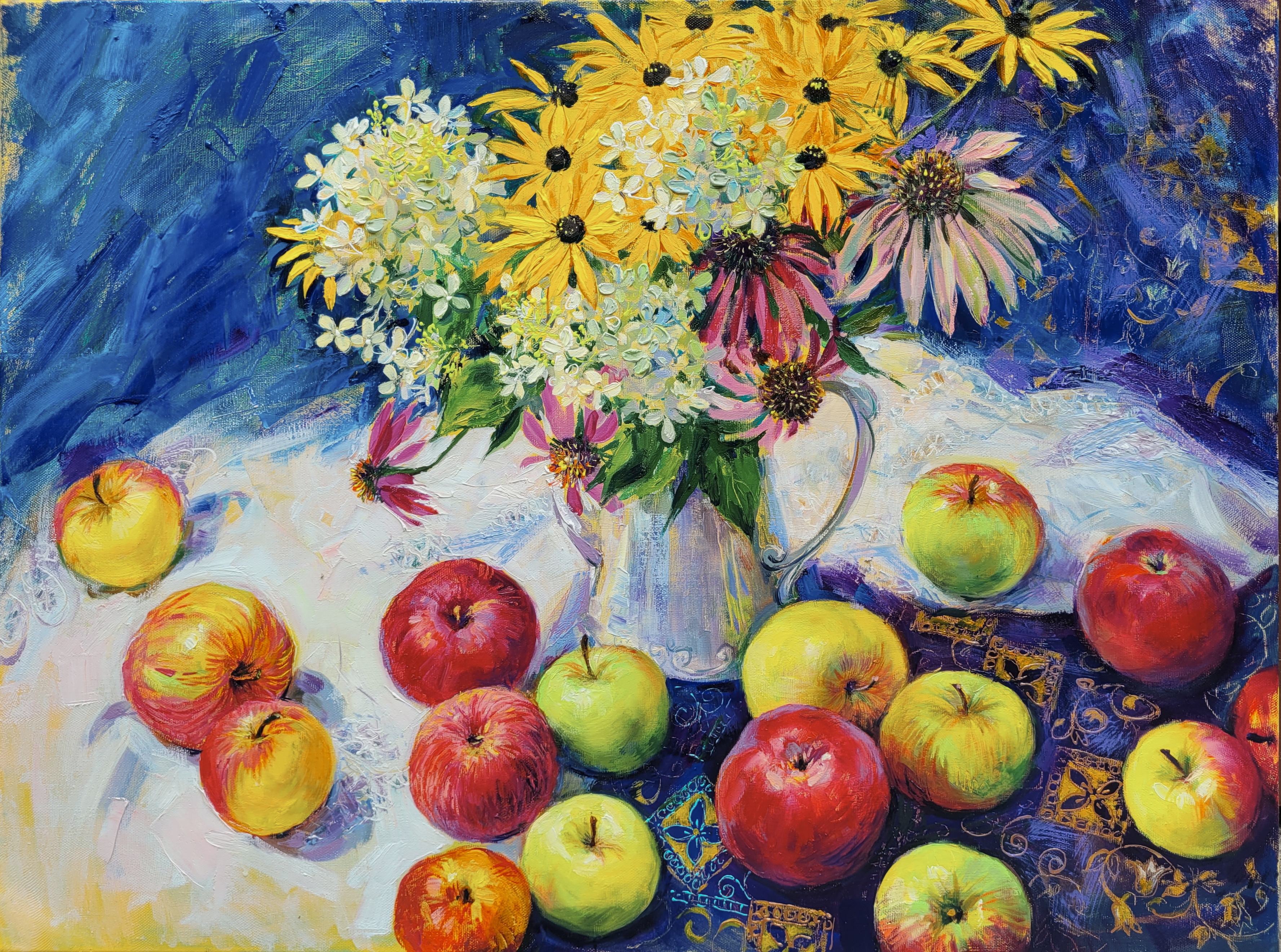 "The aroma of ripe apples" — an original oil painting on canvas, painted from life in mid-August. Juicy ripe apples, delicate hydrangeas, and echinacea create a bright, lively still life filled with the warmth of summer sun and the gentle breath of approaching autumn.