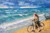 Картина «Пока не начался дождь» — тёплый, кинематографичный образ, в котором переплетаются детская храбрость, ветер перемен и дыхание природы. Девочка с велосипедом идёт вдоль морского берега — в тот самый момент, когда над горизонтом сгущаются тучи, но дождь ещё не начался. Волны играют на ветру, платье трепещет, воздух наполнен солью, надеждой и неизвестностью.