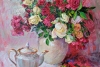 "Вкус лета» — яркий и жизнерадостный этюд с натуры, написанный маслом на холсте. На картине — букет пышных садовых роз в тёплой кремовой вазе, спелая клубника, чайник с золотым краем и свет, словно растворённый в воздухе летнего утра. Это не просто натюрморт — это аромат свежих ягод, шелест лепестков и уютный ритуал летнего чаепития на веранде.