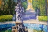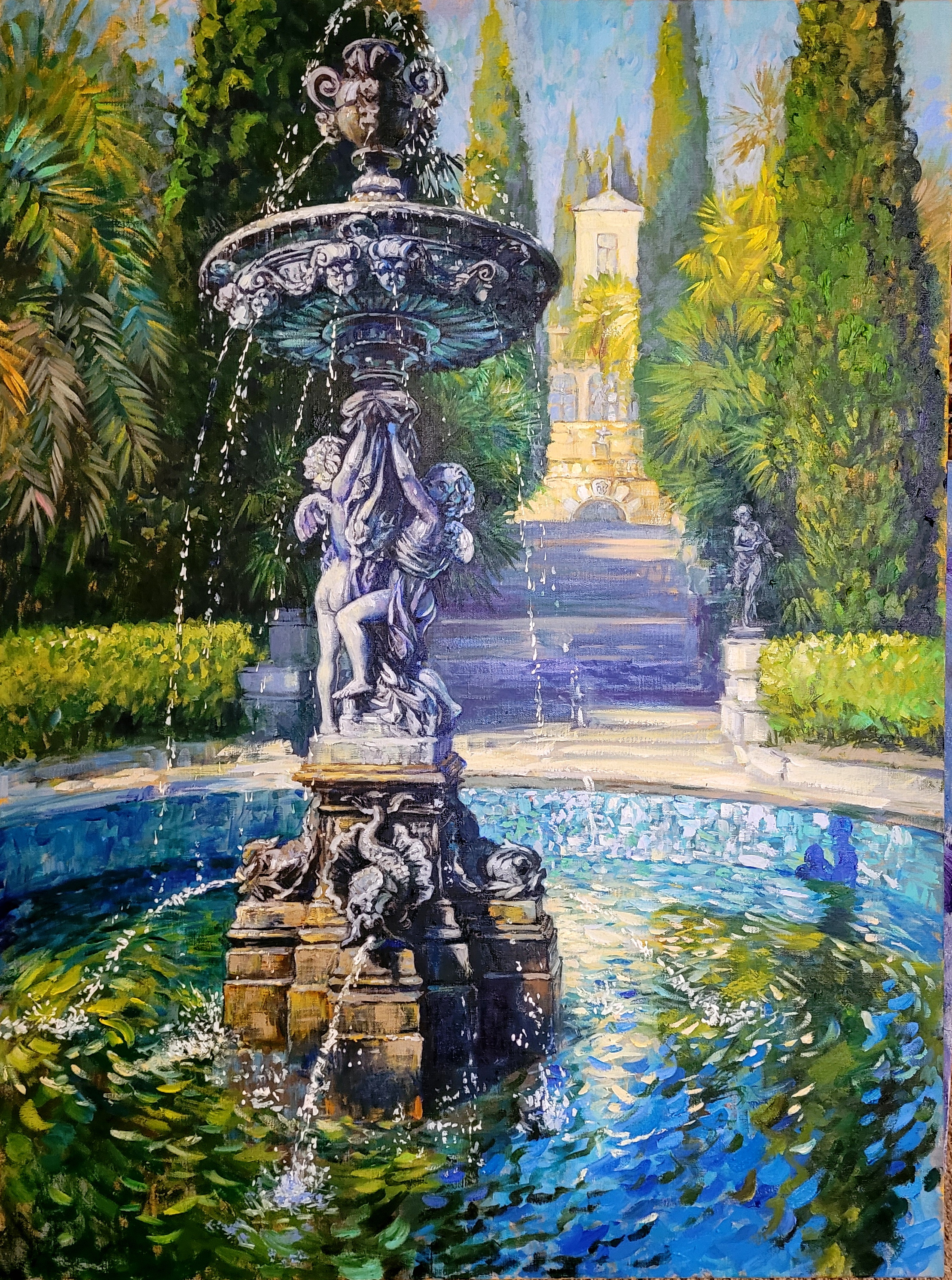 Оригинальная большая картина маслом на холсте, натянутом на подрамник, размером 120х90. На картине изображён самый красивый фонтан в парке Дендрарий в городе Сочи. Это фонтан с амурами. Южный пейзаж, море солнца, буйство зелени, пальмы, кипарисы, прозрачные струи воды, ниспадающие с высоты в бирюзовый бассейн. Ещё этот фонтан называют фонтаном любви.