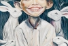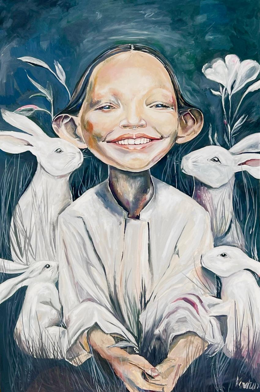 Surrounding her are white rabbits — not animals, but symbolic beings of purity, intuitive perception, and gentle guardianship.
