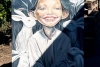 The central figure, an alien-like child, embodies innocence and radiance. Her elongated features — the neck, ears, and luminous face — are intentional, reflecting the non-human, ethereal nature of bliss as a state that goes beyond the mind and body.