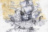 Выбор туши и золотого акрила не случаен. Здесь видны две части, соединенные друг с другом композиционно . Те коннотация драматического события, написанная золотой акриловой краской, должна увлечь зрителя в пространство мечты. А часть, написанная тушью - в пространство реальной драмы. На переднем плане морские чудовища, от которых спасенья нет.