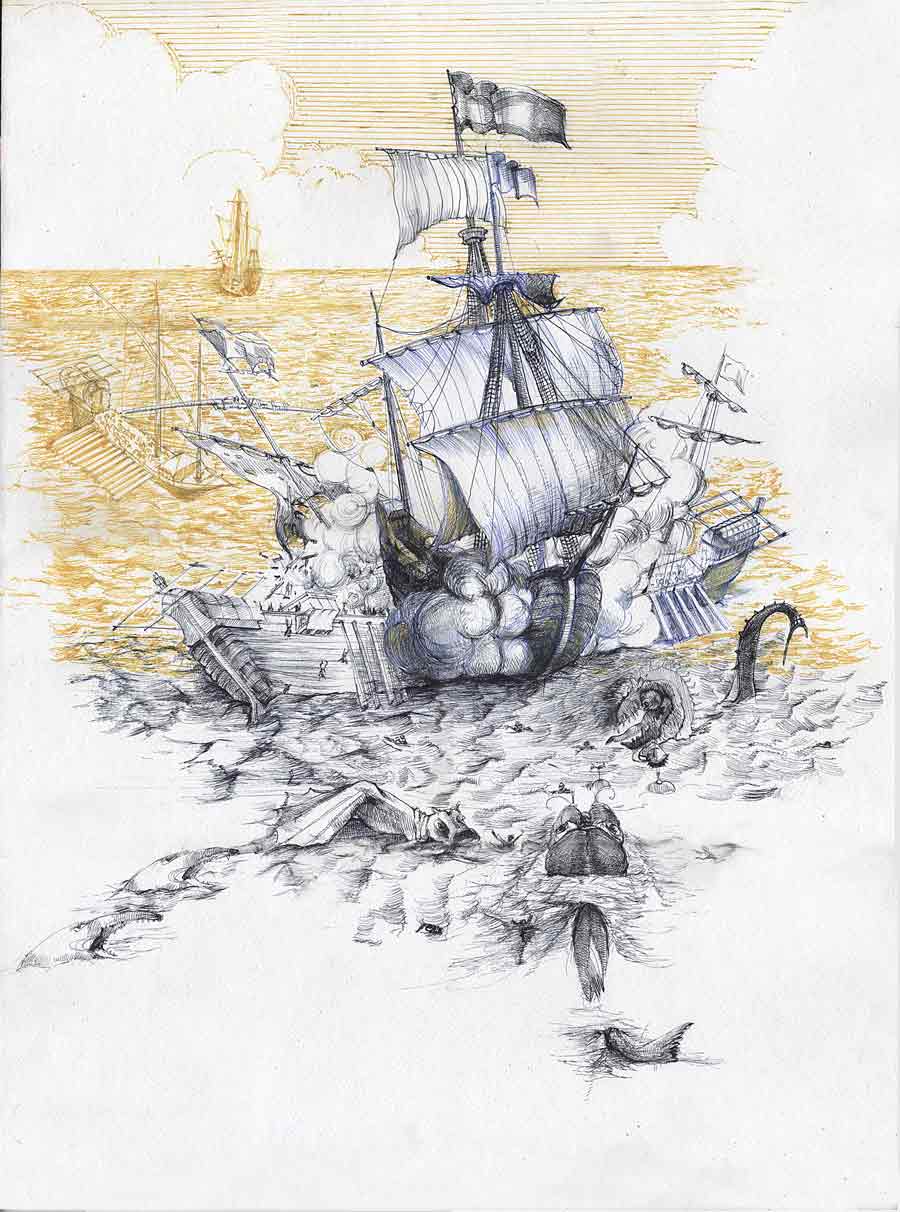 Серия "Морской бой" состоит из двух листов, которые написаны тушью и золотой акриловой краской. Сюжет не имеет реальных литературных ассоциаций.