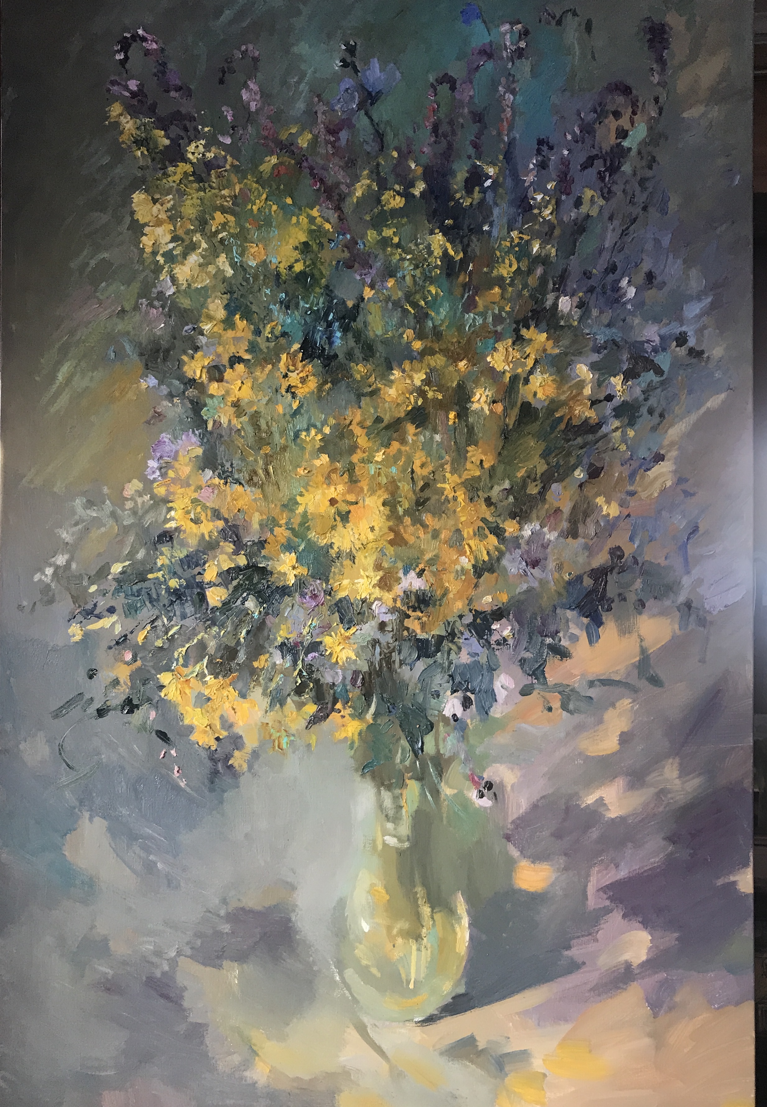 Букет собран утром в полной тишине за городом. Еще на паутинках слегка покачивались капельки росы и утренняя дымка рассеивала первые лучи солнца. Это было в начале сентября. Букет я поставила под кронами берез. Ветер покачивал стволы деревьев. Солнечные лучи, проходя через крону, танцевали с цветами вальс. Все двигалось согласно великому замыслу Творца. Звучала музыка!