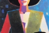 В центре композиции – женщина, чье лицо и фигура деконструированы на плоские, геометрические плоскости. Эта стилизация не лишает образ эмоциональности, а, наоборот, концентрирует ее. Лицо разделено на зоны разных, порой неожиданных цветов: фиолетовый, розовый, оранжевый, что подчеркивает сложность и многогранность ее внутреннего мира. Большие, темные поля одежды и черные волосы с вороной на голове, создают сильный графический акцент.