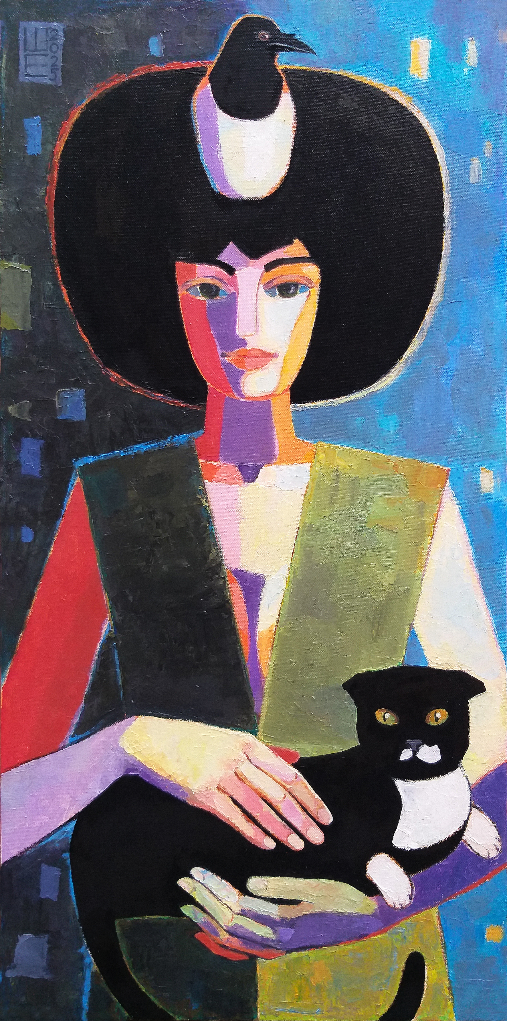 Картина Елены Шипиловой “Мой дом там, где мое сердце” – это яркий, стилизованный портрет, который через призму кубизма и экспрессивного цвета исследует темы привязанности, самоидентификации и уюта. Художница создает мощный образ женщины, которая нашла свое место в мире благодаря глубокой связи с близким существом.