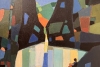 Композиция разделена на несколько планов, созданных с помощью мозаики из цветных блоков. Преобладают глубокие, насыщенные тона: темно-синий и черный в верхней части, что создает ощущение тени, гор или густого леса, обрамляющего центральную сцену. На этом фоне выделяются яркие вкрапления зеленого, синего и охры, символизирующие растительность и небо.