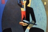 Around the central figure dominates a large oval or egg-shaped contour, executed in light pastel tones. It frames the composition, creating the effect of an aura or a kind of «cage» from which there is no escape.