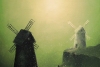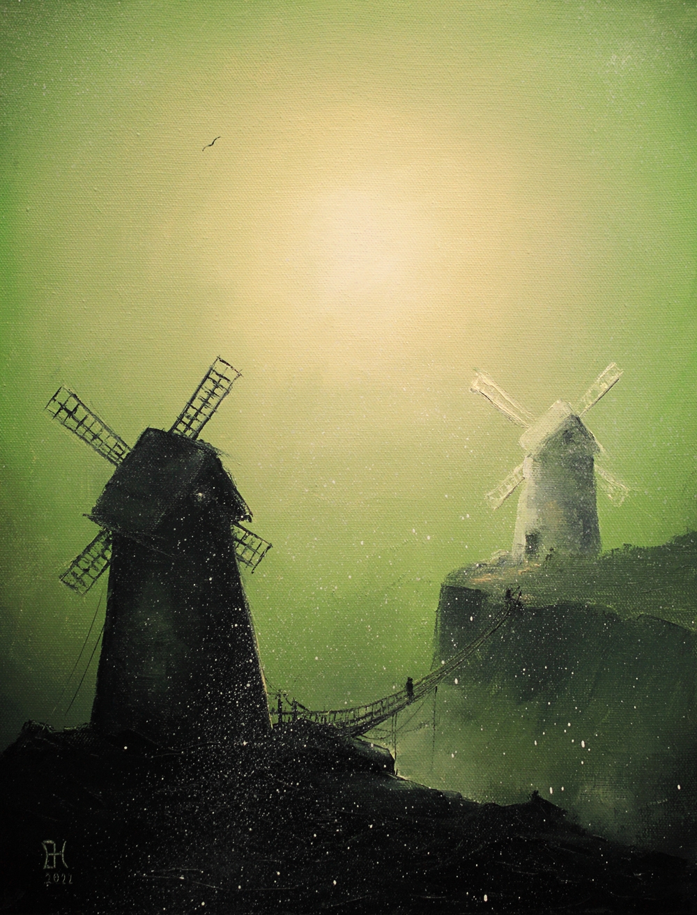 The canvas shows two windmills, each embodying a certain path or state. One, dark and imposing, stands in the foreground, as if offering a proven but possibly dangerous path. The other, light and airy, rises on a distant hill, enticing with its promises. Between them is a fragile bridge, along which tiny figures of people move, symbolizing ourselves at moments of making important decisions.