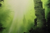 The composition is built on contrast: massive stone ruins, whose outlines resemble the remains of towers, slowly dissolve into the emerald mist of the forest. Rays of light piercing through the moist haze create an atmosphere of sacredness, as if illuminating a monument to a civilization of which only legends remain. Klyuev masterfully uses shades of green — from deep, almost black shadows to light, otherworldly tones of light — conveying a sense of mystery and tranquility.