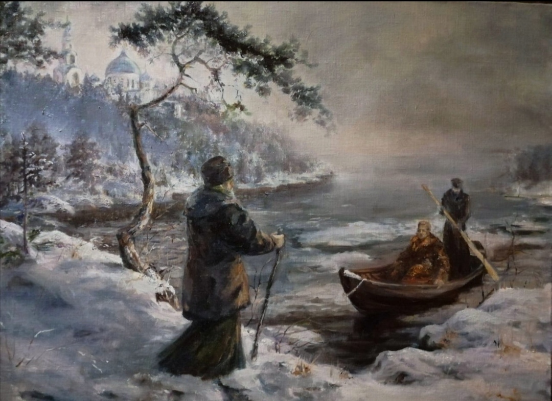Картина из авторского цикла " Зимние грёзы Петра Ильича Чайковского "Угрюмый край, туманный край» по мотивам второй части симфонии композитора. Эта часть программной симфонии написана по впечатлениям от посещения монастыря на острове Валаам.
