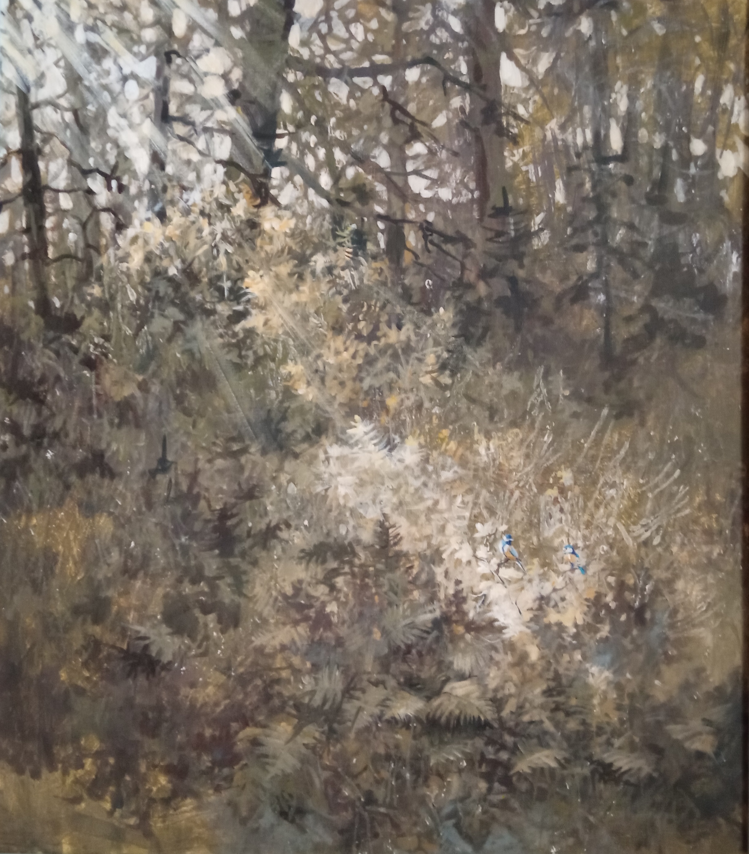 Природа дарит восхищение Тенистый лес и сквозь густоту листвы солнечный свет прорывается свои подарить жизнь и теплоту травинкам и росточкам Вдохновение пришло в воспоминаниях.Детсво мое прошло в единение с природой.Частые походы с родителями в лес и любовь к жизни.Работа выполнена акрилом на холсте.Цветовая гамма монохромная,как кинолента памяти.