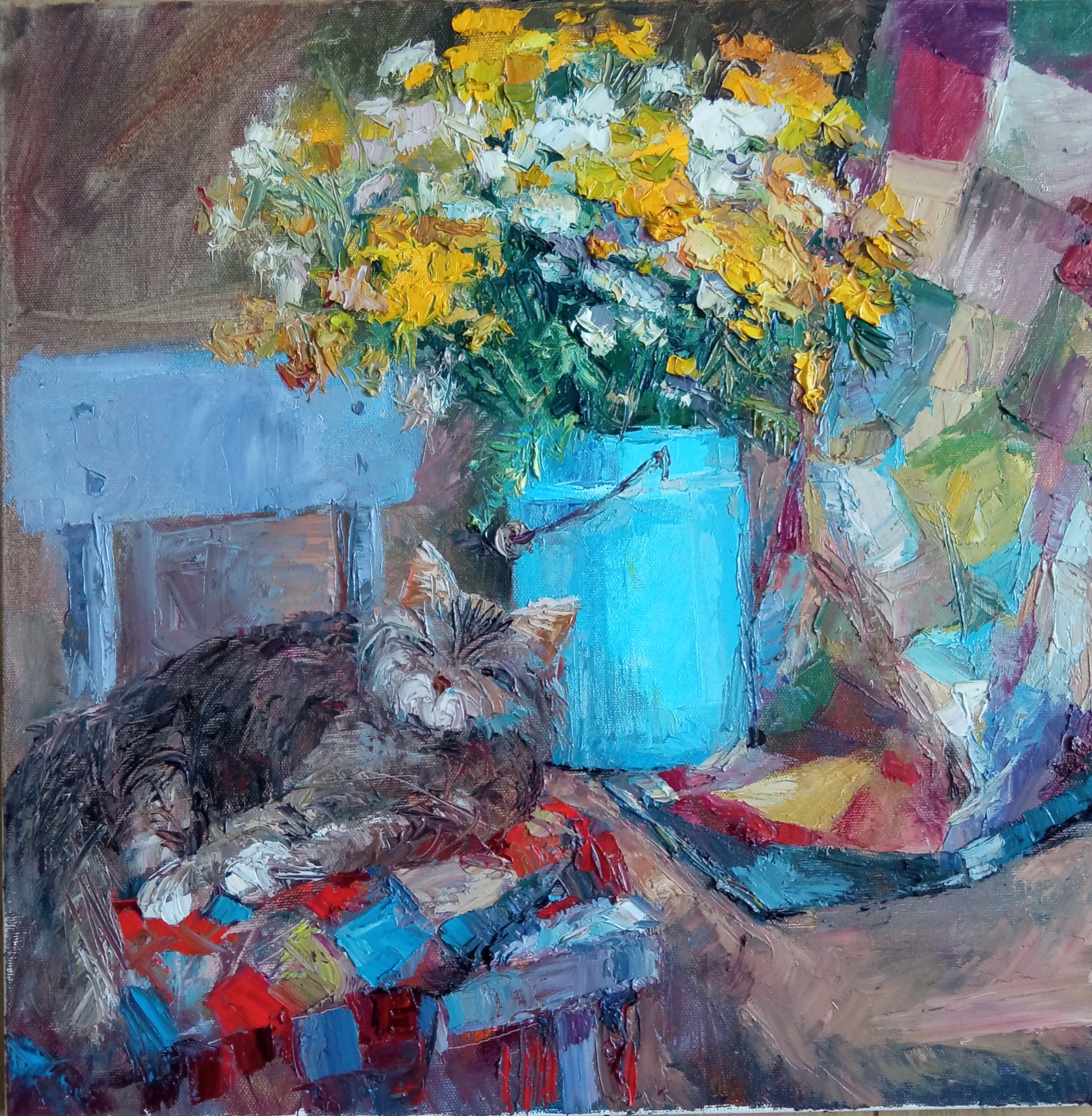 Радость бытия. Уютная атмосфера. Кошечка Муся стала натурщицей: при написании натюрморта она улеглась под софит и мирно сопела во время работы. Сам сюжет без этого милого существа был бы скучен, согласитесь.