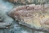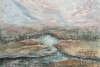 The painting is created on canvas using the mix media art technique. It depicts a river bay. The water in the river has a bluish tint, which creates a feeling of coolness and tranquility. Around the river, there are patches of land covered with vegetation that appears slightly blurred, giving the image a dreamy and abstract character. Hills rise in the background. The sky above the hills is painted in soft pastel tones, creating an atmosphere of calm and serenity. The painting is executed in a technique that combines elements of abstraction and realism, allowing the viewer to feel both the physical reality of the landscape and its emotional atmosphere.