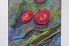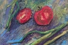 The green onion stalks are painted more graphically, in shades of green and yellow, with clear, elongated lines. They create a contrast with the round shapes of the tomatoes and add dynamism to the composition.