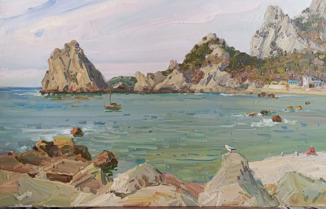 На изображении представлен пейзаж, написанный маслом. Вид на море с гористым берегом. В центре кадра видна морская гладь с зеленовато-голубым оттенком. На воде несколько покачивающихся лодок. Вдали виднеются скалистые берега, покрытые растительностью. На переднем плане – каменистый берег с большими валунами, на одном из которых сидит чайка. Справа на пляже видна фигура человека в красной одежде. Небо бледно-розового цвета с легкими белыми облаками.