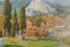 Изображение представляет собой пейзаж, выполненный масляными красками. На переднем плане изображена зелёная лужайка с травой, написанной крупными мазками. Слева видны три высоких кипариса с тёмно-зелёной листвой. За лужайкой расположен кустарник с красно-розовыми цветами. На заднем плане находится небольшой холм с деревьями, листвы которых имеют осенние оттенки: жёлтый, оранжевый и коричневый. Справа от холма видны два белых домика с красными крышами. На заднем плане возвышается большая гора с белыми скалами, уходящая в голубовато-серое небо с лёгкими облаками. Справа на тропинке стоит фигура человека. Он одет в одежду светлых тонов.