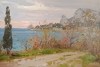 Изображена картина с морским пейзажем, написанная маслом. На переднем плане видна дорога, выполненная в светлых тонах с примесью зелени, имитирующей траву по краям. Слева растет высокое темно-зеленое дерево, напоминающее кипарис. Рядом с ним на земле лежит темный предмет, похожий на камень или лодку. На заднем плане расположено голубое море с небольшими волнами. Вдали виднеется небольшой парусник. На горизонте расположен скалистый берег с небольшими постройками, а также горный массив. Небо покрыто облаками в серых и розоватых оттенках, создающими эффект заката или рассвета. По всей картине разбросаны кустарники и деревья с осенней листвой, окрашенной в желтые, оранжевые и красные тона. Они обрамляют морской пейзаж и придают изображению глубину.