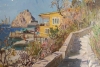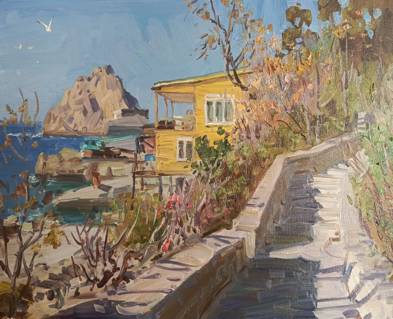 The painting depicts a coastal landscape. On the left side, the Diva rock rises above the blue sea. Two white birds are flying in the sky. To the right of the rock, there is a yellow two-story house with a balcony. Around the house, trees and shrubs with yellow and green leaves grow. In front of the house, stones and a path are visible. On the right side of the painting, there is a stone staircase leading upwards. Shadows are visible on the steps of the staircase. Trees and shrubs grow on both sides of the staircase.