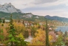 In the background, mountains rise, some covered with greenery, and the peak of one mountain is made of gray rocks. The sky above the mountains is light blue with white clouds. The sea water has a gray-blue tint, creating a contrast with the warm color of the foliage. The overall atmosphere of the painting conveys the tranquility and picturesque beauty of an autumn day in a seaside town.