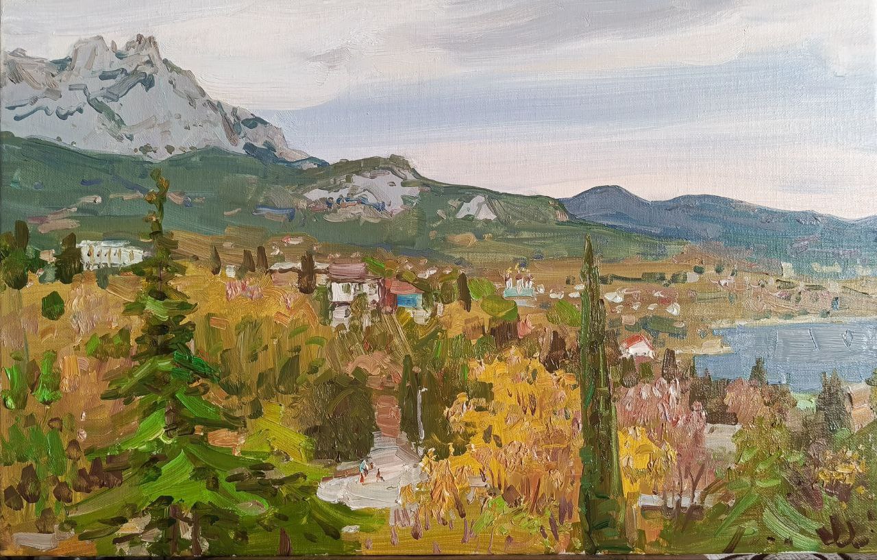 The image depicts a picturesque landscape painted with oil on canvas. At the center of the composition is a view of a coastal town stretching along the seashore. Houses with red and blue roofs are scattered among trees with yellow and orange foliage, indicating the autumn season.