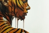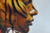 The oil painting on canvas titled "Sunrise" depicts a woman with a face and body covered in stripes resembling a tiger's skin. The stripes are painted in orange and black colors on a white background. The painting is complemented by drops of paint dripping down from the woman's chin.