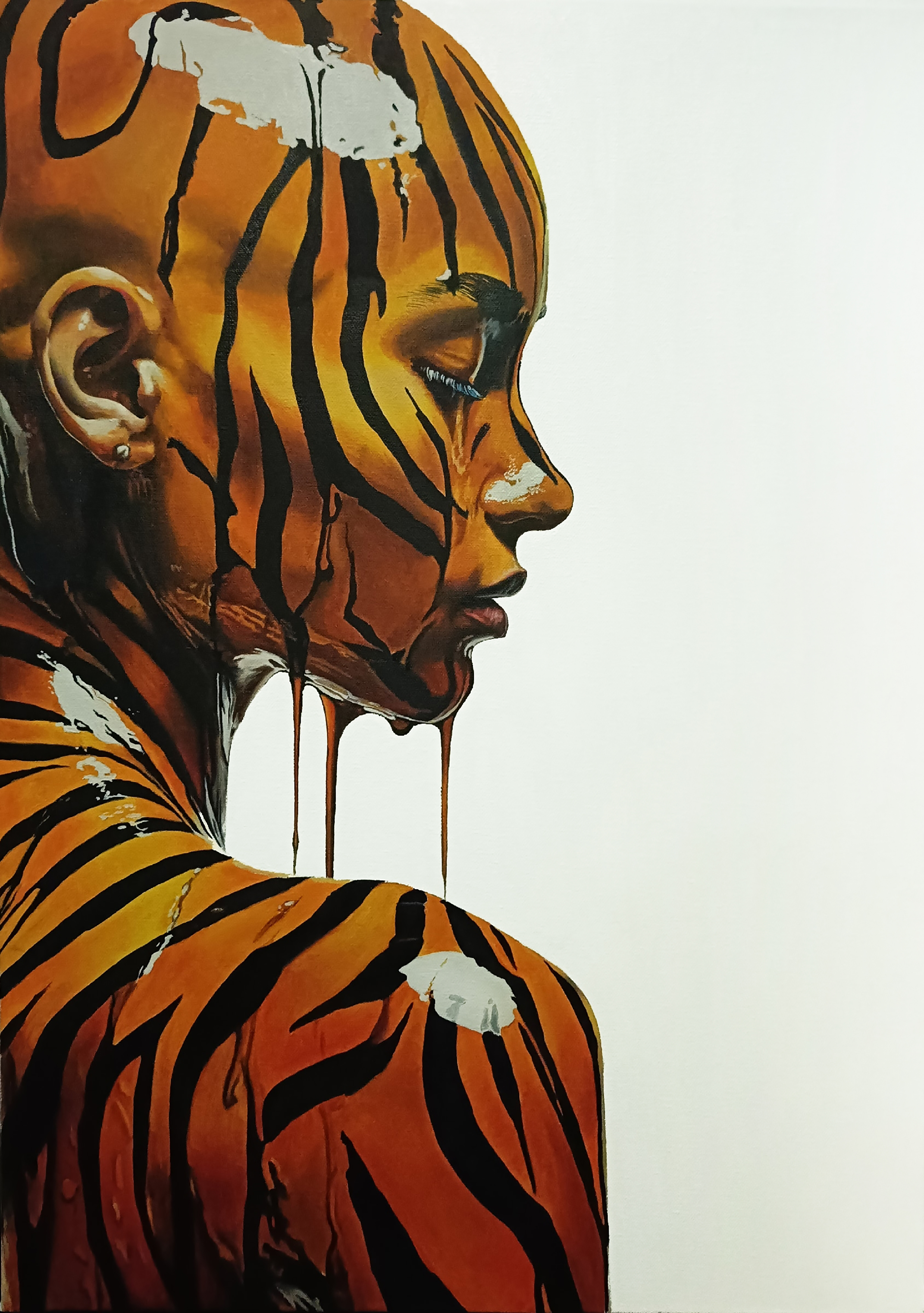 She wakes up at dawn in a world where the boundaries between reality and fantasy are blurred. She feels her body covered in stripes resembling a tiger's skin, and it is not just a decoration; it is a symbol of her inner strength and freedom. Every day, she faces a new dawn, feeling her soul filled with energy and determination. The drops of paint that drip down symbolize her emotions and experiences, which she leaves behind as she begins a new day with a clean slate.