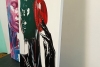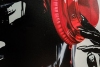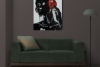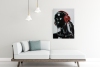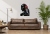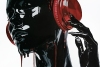 In the oil painting "Silence," the image is carved out of black, shiny obsidian. It is adorned with a pair of bright red headphones, and the model's closed eyes suggest a deep state of contemplation. The black paint flows like a living substance, creating a striking and mesmerizing contrast with the rich red color. This painting is a powerful representation of focus and immersion, capturing a moment when the world of sound envelops and brings inner peace.