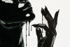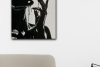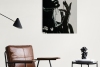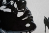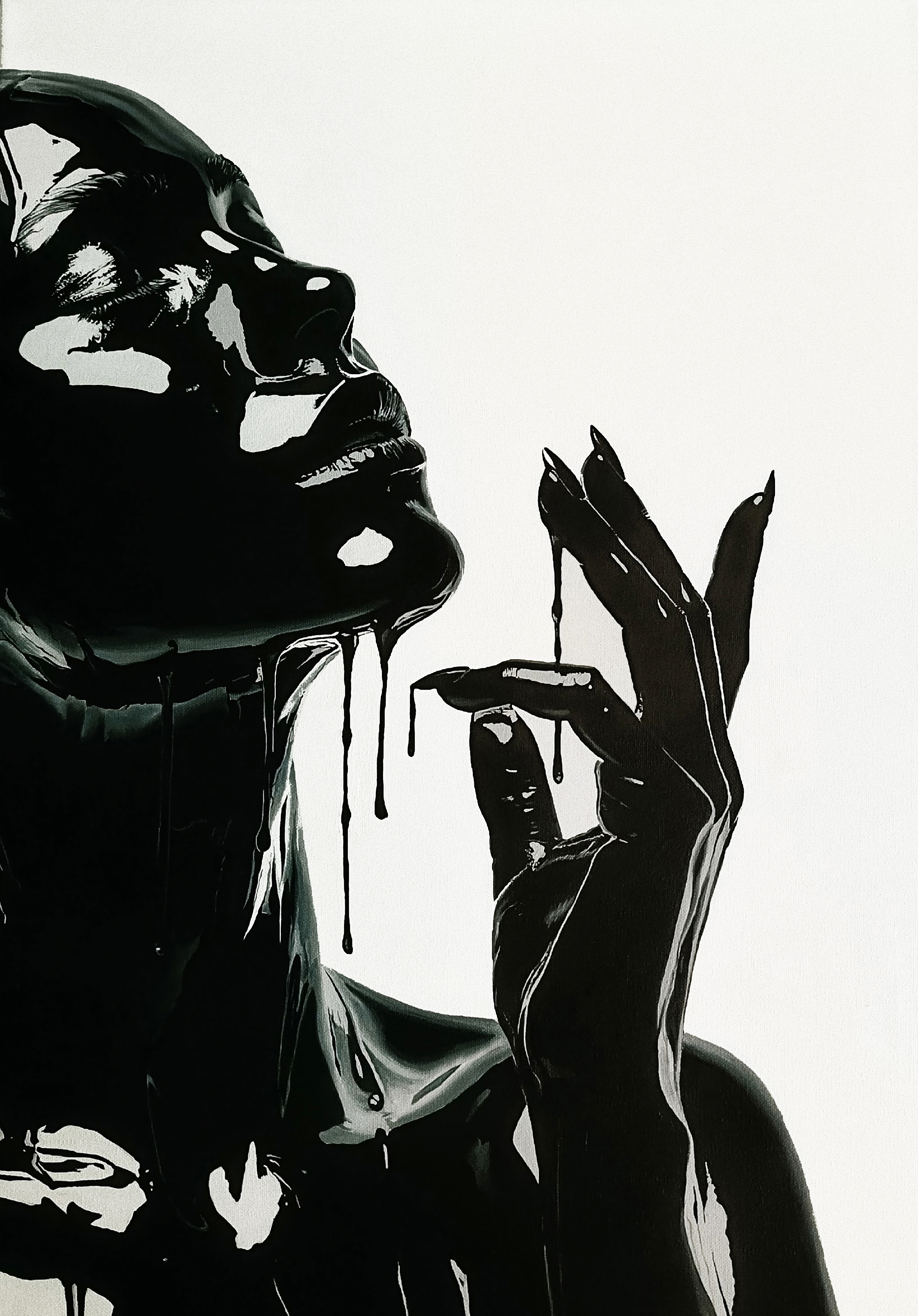 Minimalist monochrome oil painting on canvas. It depicts a portrait of a woman whose figure seems to be immersed in a liquid black substance, creating a sense of graceful movement. The stark white background emphasizes the purity and simplicity of the composition. The soft drops and smooth lines create a calming, serene atmosphere that conveys a sense of peace and unhurried satisfaction.