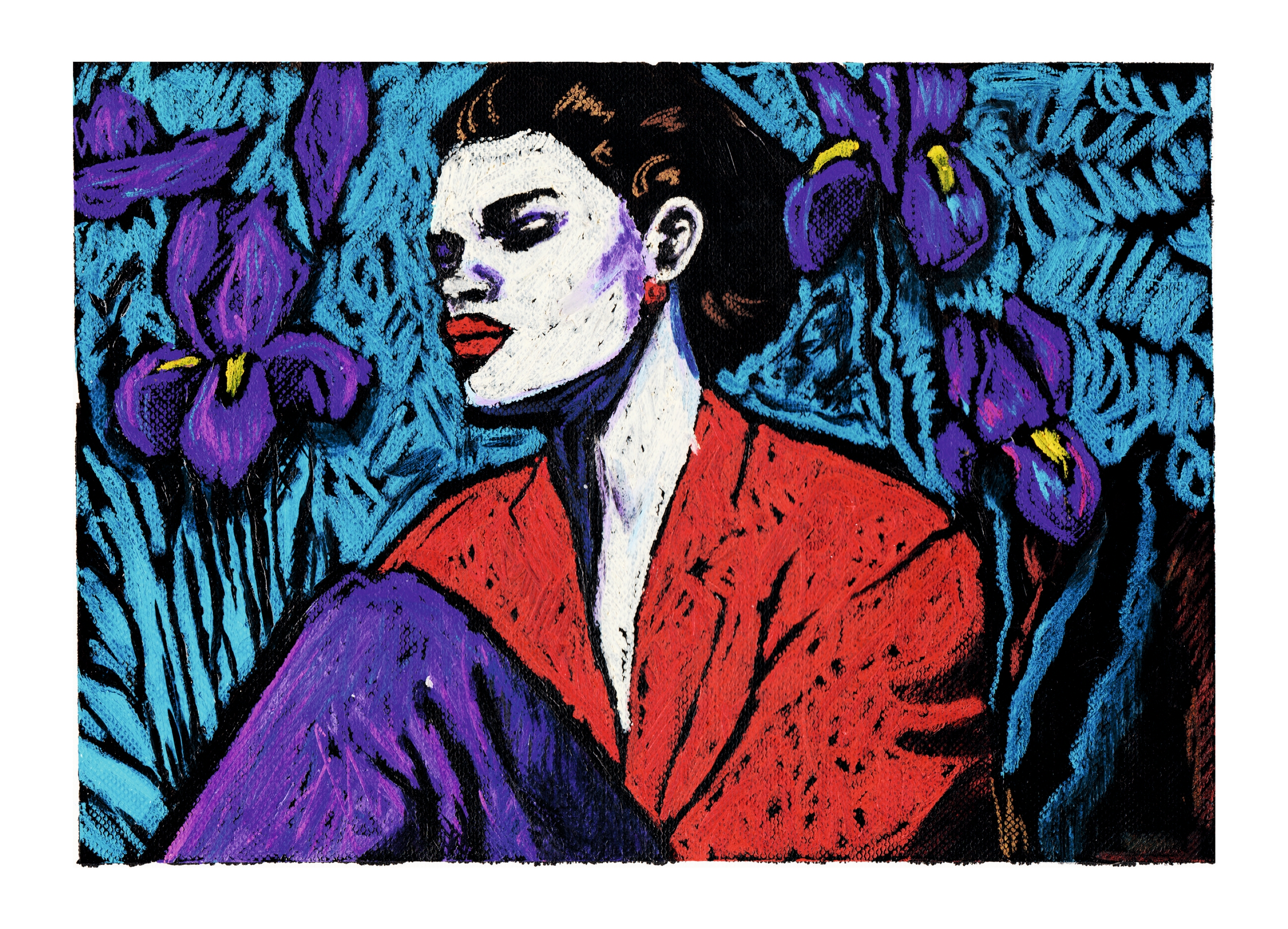 Молодая женщина, изображённая по пояс, сидит в густой растительности. Она смотрит решительно, слегка отводя взгляд, что придаёт образу задумчивость и независимость.