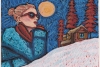 Яркая и выразительная картина, выполненная масляными пастелями и акрилом на бумаге. Женщина в солнцезащитных очках и синем пальто смотрит вдаль на ночное небо с жёлтой луной. Справа находится бревенчатая изба, покрытая снегом, и оранжево-красные ели. Стиль очень текстурный, с заметными пастельными мазками и сильным цветовым контрастом. Атмосфера динамичная и зимняя.