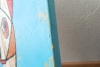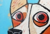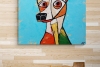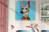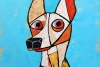 Художник сочетает угловатые формы и яркие оттенки — синий, красный, оранжевый и желтый — чтобы передать дух, преданность и игривость животного.
