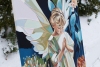 Особое внимание привлекают крылья: они выполнены в уникальной манере, напоминающей витражное искусство, где каждый сегмент света гармонично сочетается с общим обликом. Окружающий ангела растительный мир — экзотические цветы и листья — прописан в насыщенных синих и глубоких тёмных тонах, что создаёт сильный контраст с нежной, светлой фигурой. Это подчёркивает хрупкость и чистоту образа. Мария